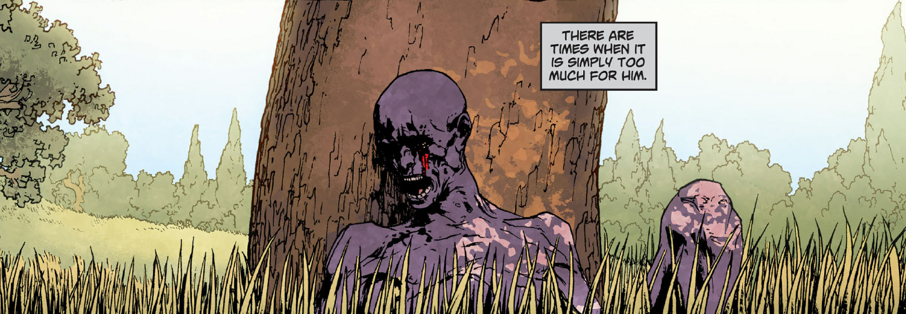 Anton Arcane is seen rising from a lake and only his hand and wrist are seen clearly. Abby's young brother who can talk with The Rot has summoned "his master" to face The Swamp Thing. He is the new Avatar of the Rot. He is attempting to control the Green and the Red as well as the Rot. Anton Arcane finds Swamp Thing asleep and beats him to death while he sleeps before starting the hunt for his niece. Arcane unleashes his Un-Men on Abby and attempts to bring her back into the Rot with him. Swamp Thing awakens and tears through the Un-Men to save hr. After defeating all the Un-Men, Alec and Anton go at it in a savage battle wherein Alec hacks off most of Anton's limbs. Anton however, now has the ability to grow mouths from every wound he received. Anton returns to the Rot after Abby shoots him in the face but vows revenge. Shortly after both Animal Man and Swamp Thing enter the Rot in order to restore balance come into contact with Arcane within the Rot. He reveals that because the Green brought Alec back to life the Rot was allowed to use someone they wanted to bring back to life thus allowing Arcane to come into power. Anton Arcane was seen in the Green park naked and alone and he kill a bunny and looks at the dead animal and it cameback to life and he stabbed its eyes and Anton Arcane bleed out in his eyes. Anton Arcane saw the bodies of himself in the Green and all of a sudden he saw his niece Abigail as a new member of the Green and Anton Arcane saw her and they talked about the past life of Abigail Arcane and that he was the one that infected her Mother with the virus of the Rot after telling her stories that she never hears before at all. Abigail called her Uncle Anton Arcane a monster and she told him that he will never will leave the Green and he will never escape to get to the Rot. Anton Arcane said he will see. Abigail Arcane left and said to Anton Arcane never again. In the kitchen a boy was going to eat an apple and his mother saw it was a rotten apple and she said to her son that has a worm in it and the boy threw it in the garbage and a eye of Anton Arcane was seen in the garbage waiting to escape again.
