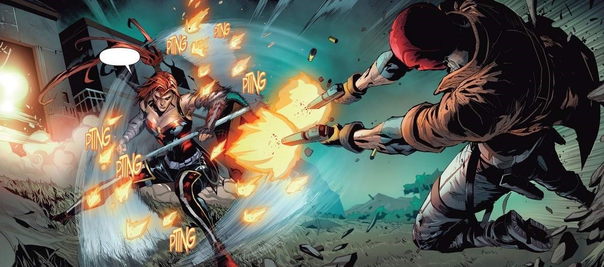 After spending over a year searching, she was able to get a solid lead by interrogating a US Senator. Heading to Gotham to chase down the lead. Her search led to a train being robbed by Red Hood, Black Mask, and and his gangsters. After easily dropping the gangsters, she threatens Red Hood. He explains he is only searching for a weapon, but Artemis is surprised that he doesn't understand that he is handing over a world destroying power. Not being intimidated, Red Hood tries to shoot her, hoping to take advantage of the fact that she doesn't possess traditional Amazon Bracelets. However, she uses Mistress, her mystic axe, to deflect the shots. Deciding the use of a weapon was unnecessary, she decides to use her hands instead. She then proceeds to pummel him after he calls her "princess," a term that strikes a nerve.