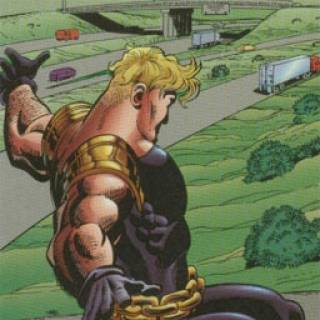 The god Argus then teleports Hardcase and other ultras to another dimension to recover the keys to the Crucible of Life for him. Rebelling, the ultras fight Argus. The kidnapped Ultras split into two factions, those willing to serve Argus and those wishing to oppose him. The escapees travel to the Godwheel on the 'Godyacht' itself to take control of the keys. Hardcase gains a new uniform and teams up with the heroine Flygirl to search for the key called the Roc's Egg. They lose the key to Lord Pumpkin and Flygirl is blasted off the edge of a cliff and falls to her death. This deeply traumatizes Hardcase.