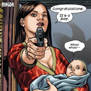 At the time she left, Magda was pregnant with twins. Whether she knew it at the time or not is unknown, but she never told Magneto of it. She stayed on the run in eastern Europe, evading her husband. Heavily pregnant, she found her way to Wundergore Mountain and to the hut of Bova the Midwife. After a short time staying with Bova, Madga gave birth to a boy and a girl, whom she named Wanda and Pietro. (They would grow up to become the superheroes Quicksilver and the Scarlet Witch.)