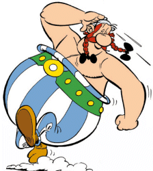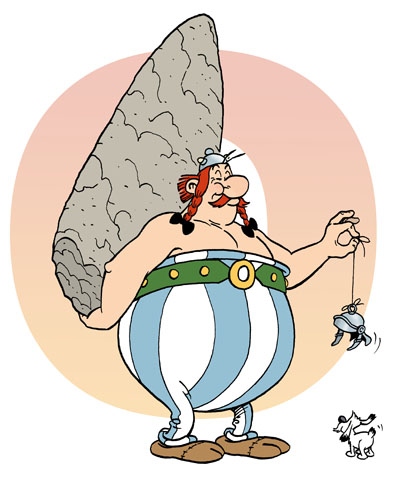 Obelix is a cartoon character from the series Asterix and Obelix, the French duo of René Goscinny and Albert Uderzo. There are only two things that enrage Obelix and make him dangerous: to be called "fat" or "big" and seeing his dog Idefix in danger. When those two things happen, he turns into an angry, dangerous man. Obelix, when in a bad mood, can take out an army of Romans. He once had the entire army of Roma as a birthday present, as his fellow soldiers and friends cheered him.
