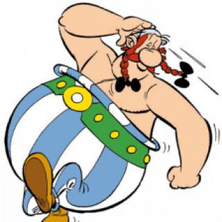 Obelix is the great friend of Asterix, who is his inseparable companion of adventure, along with Idefix, his faithful dog. Obelix has superhuman strength, because as a child he has fallen in a cauldron in which the druid of the village, Panoramix, was preparing his magic potion. Sculptor and trader of menhirs, he spends his free time to stroll and chat with Asterix, to hunt wild boar and beat the Roman legionnaires. He is a genuinely kind character with an appetite of steel and there's nothing he loves more than a good meal around the fire with all his friends and large quantities of wild roasted boar. His quote is:"ils sont fous ces romains?" which means "are those romans crazy?"