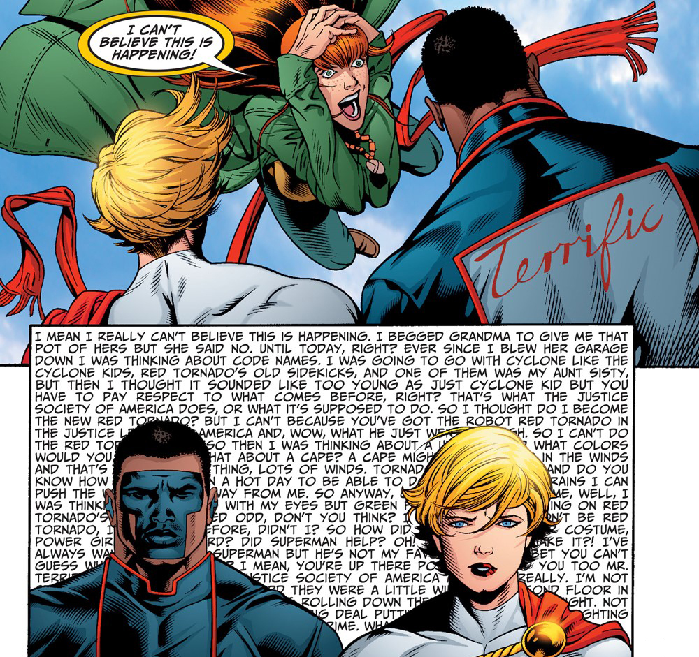 Power Girl began her very first adventure when she assisted the Justice Society members Flash and Wildcat by helping them stop a volcanic eruption in China. She later became a full-time member of the Justice Society upon the retirement of Superman, and the Huntress (who on Earth-Two was the daughter of Batman and Catwoman) became her best friend.