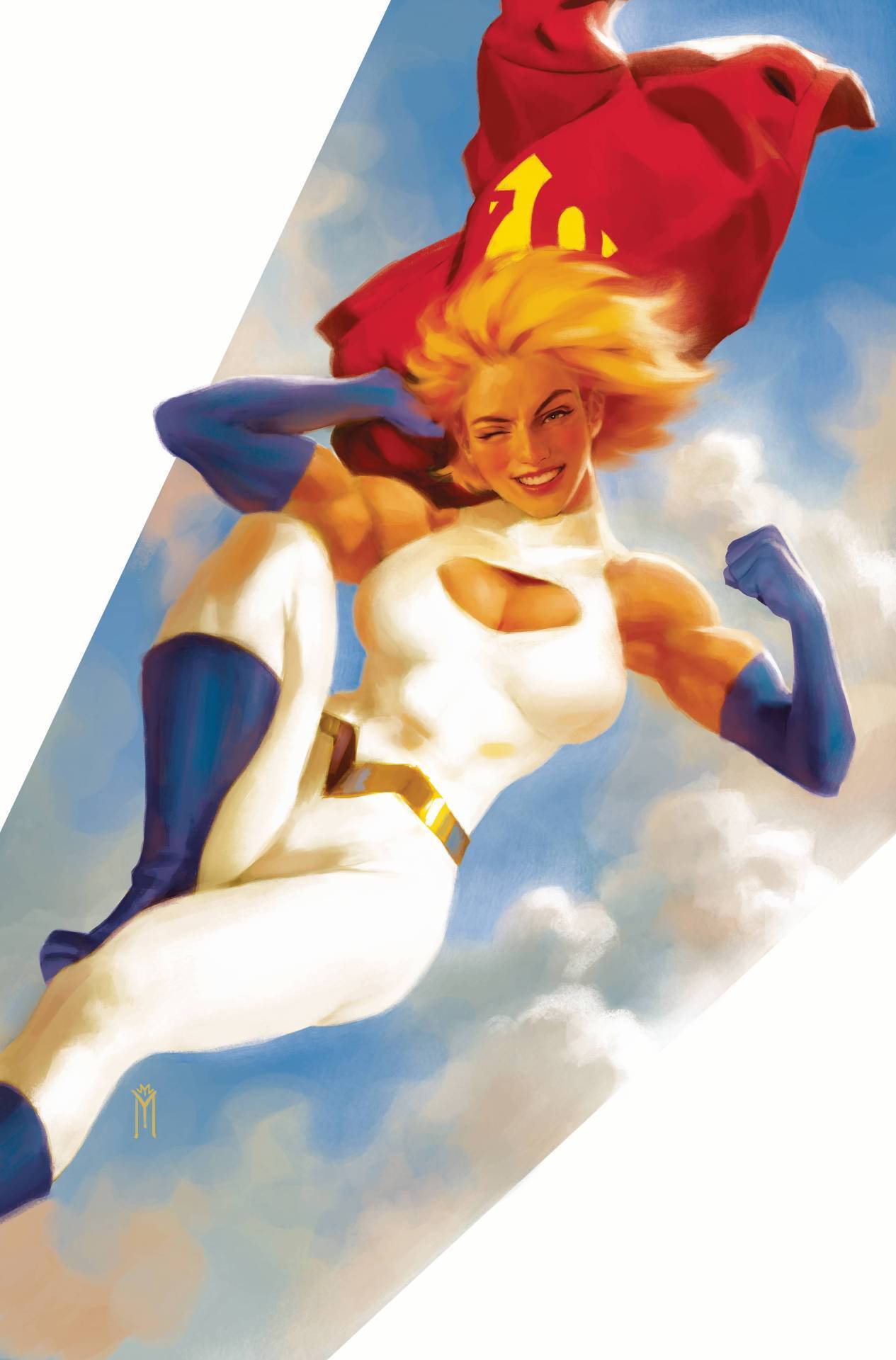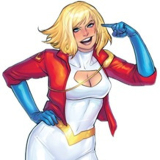 Power Girl has a highly athletic and slender physique but throughout the years, she is consistently depicted as a well-endowed young woman - to the extent that various writers have acknowledged it in both serious and humorous ways. Many fans have since associated Power Girl with her big cleavage and curvy body - turning her into a sex symbol, a pinup girl and a popular choice in cosplay. Since her debut, Power Girl's costume has been consistent over the years with a white bodysuit, blue gloves and boots, and a red cape, until recently she is shown wearing a different costume in the New 52 initiative. In JSA: Classified #1 (2005), Green Lantern once asked Power Girl why she never wore a mask and she replied, "...it's because most of the time, they ain't looking at my face."