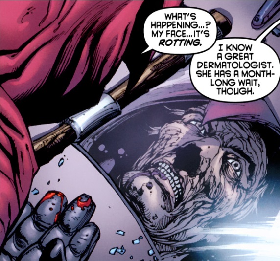 The Reaper is one of several Arkham inmates injected with a type of fear toxin that gives them superhuman strength. They try break out but Batman is able to stop them. Later when the toxin wears off the Reaper is put into critical care.