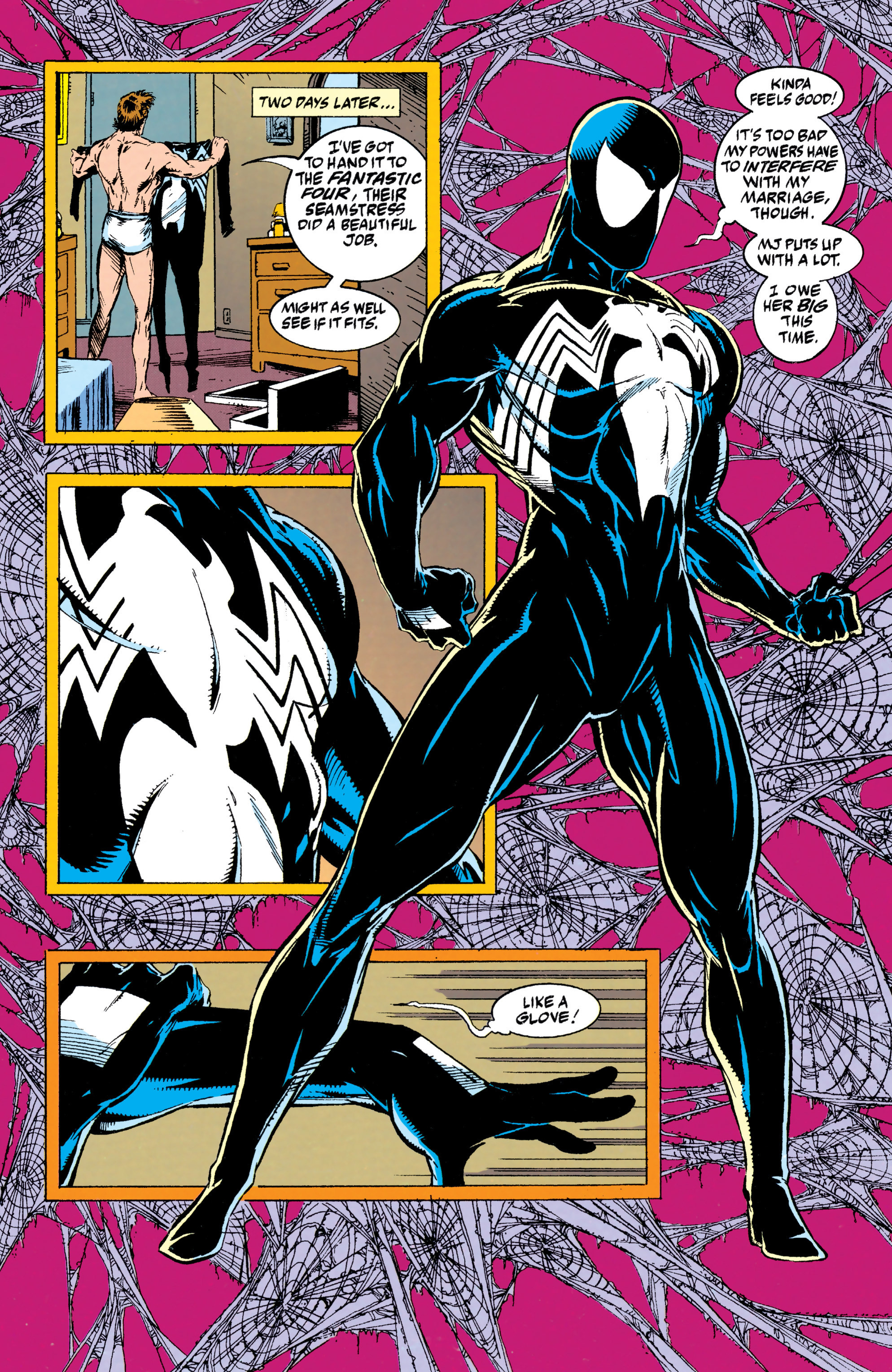 Spidey versus Carnage and VenomThe reporter Eddie Brock had accused the Sin-Eater as one man. He then became very angry with Spider-Man, when the web-slinger unmasked Sin-Eater and it turned out to be a different person. This caused Brock professional humiliation and the loss of his job. When Eddie bonded with the symbiote and became Venom, Eddie launched several attacks on Peter's life, even scaring MJ. Peter stopped wearing the black suit following MJ's request. Eddie's symbiote had an offspring that bonded with Cletus Kasady, a psychotic murderer, to become Carnage. Venom and Spider-Man were forced to team-up to defeat this new foe. Sometime later, Peter and Eddie formed a truce, promising never to interfere with each other's lives ever again.
