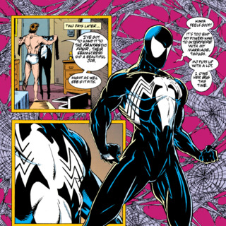 Black SuitThe Beyonder transported Spider-Man along with other heroes and villains to Battleworld to take place in the Secret Wars, an intergalactic battle between the world’s greatest heroes and villains. During the battle, Spider-Man’s suit was badly damaged and he needed a new one. Peter came upon a strange machine that produced a black substance that slithered over him and covered his entire body. This new black and white costume, similar to Arachne's costume, replaced his old costume. Once the heroes won the battle, they were all transported back to Earth and Spider-Man kept on wearing the suit because it enhanced his strength, speed, and agility. He would start experiencing odd signs of fatigue and became even more concerned when he discovered that the suit produced organic webbing. He took the suit to Reed Richards who told him that it's actually a living alien symbiote, which can only survive by bonding to a host and draining their life-force away. Reed used a sonic emitter to separate Peter from the suit. Spider-Man was now without a costume and Johnny Storm, as part of a practical joke, gave Peter an old Fantastic Four costume with a paper bag for a mask and dubbed him the Bombastic Bag-Man. Admiring the black suit's design, Spider-Man's then-girlfriend and crime-fighting partner the Black Cat made him a cloth version of the black costume which he would start using for a time. The symbiote made its way back to Peter and attempted to permanently bond with him, but Peter used the sounds of a church bell to seemingly destroy the suit. It survived and found a host in Eddie Brock to become one of Spider-Man's deadliest and most recurring foes, Venom.