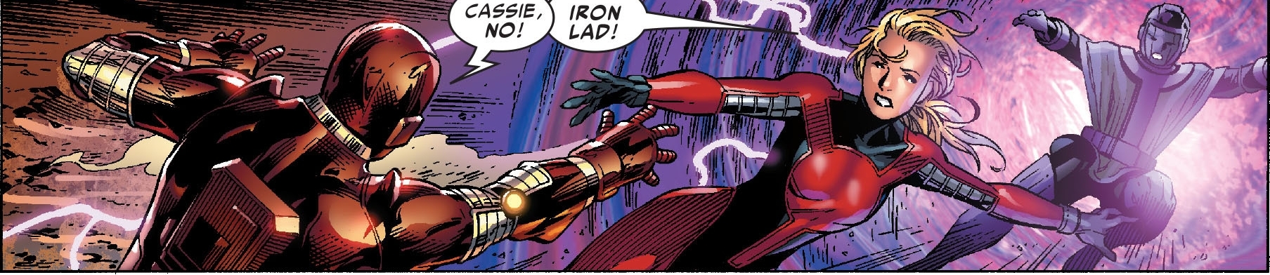 During Children's Crusade, Cassie is reunited with Iron Lad, and through the use of time travel, she was able to bring her father forward in time from the moment he was about to die from the Jack of Heart's explosion to the present. This wasn't part of the mission plan which was to save the Scarlet Witch. Since her father is alive and well, he tells his daughter he is very proud of her.