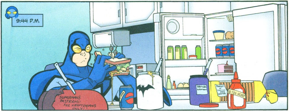 Though Ted was best known as a prankster, he was highly respected for his scientific genius. His ship, the Bug, became the main transportation for the league and he was in the lab so much he started to loose his edge as a fighter and even gained weight. This was a big problem for Ted and is something he struggled with for a long time. He was eventually helped back to fighting shape by General Glory and set up a non-powered boxing match with Guy Gardner. Ted was winning the match, but Guy lost his temper and hit Beetle between rounds when his back was turned. When Beetle fell Guy didn't let up, enraging several Leaugers.