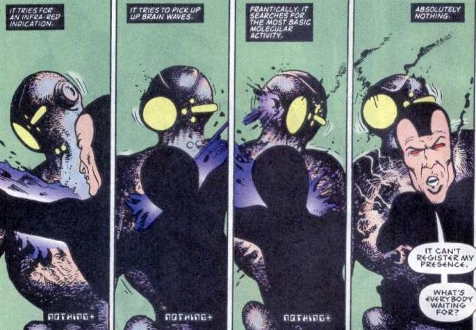 It was only defeated when Rachel Grey created a black hole inside of it, with the help of Storm, Sage and Bishop, sucking it in and teleporting it away, but not destroying it. It later returned to Earth-616, but Merlyn used the Captain Britain and Spider-Man of Earth-9411 to cast it back into the interdimensional void. It pursued Captain Britain-9411 back to his reality, slaughtering most of that world's superhumans, before Captain Britain used the Ultimate Nullifier to destroy it.