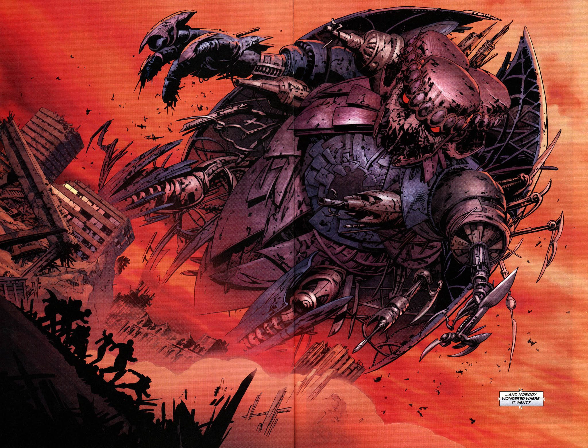 Nova then removed the test field restriction, allowing the Wild Sentinel to grow monstrously huge by integrating immense amounts of technology adapting into a supersonic jet plane. Having smashed into Genosha, it quickly was able to annihilate a vast majority of the population there but then deactivated after Cassandra Nova was captured: having no one left, Trask or otherwise to provide it orders. The inert carcass nevertheless stood within the ruins of the once-mutant capital of the world as a memorial to those who were ruthlessly killed that day. When Genosha was fully abandoned the second Wild Sentinel fell into the ocean and was left buried there.