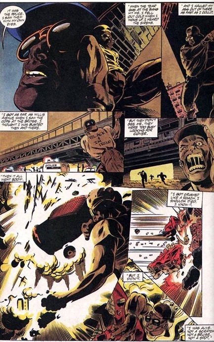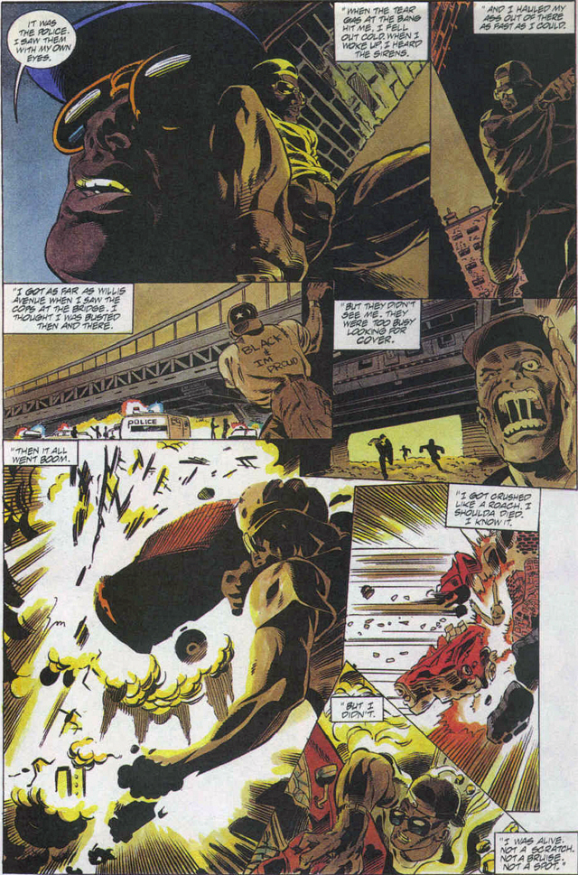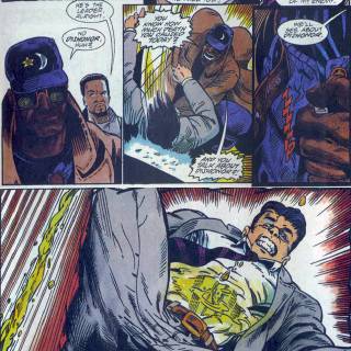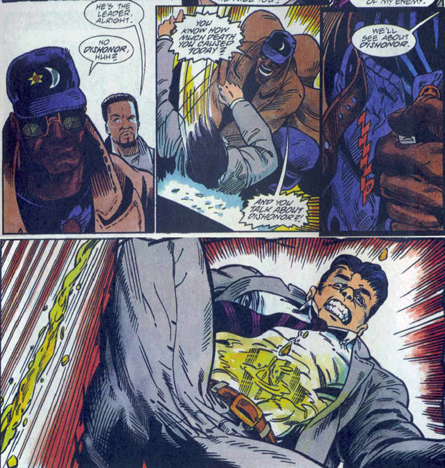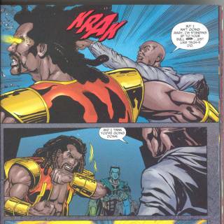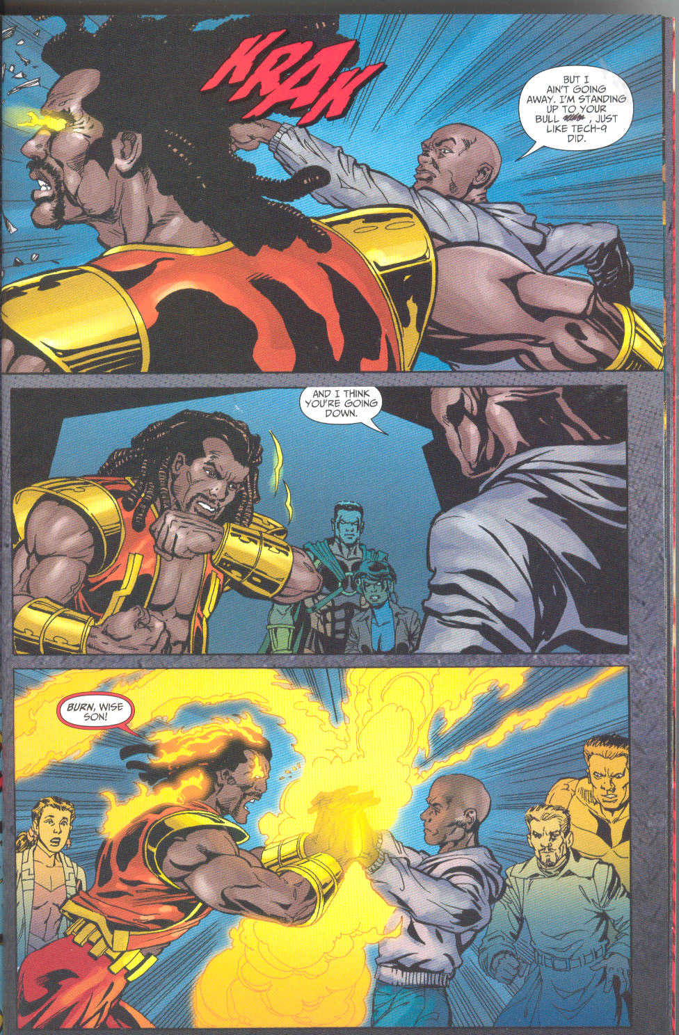 Wise son battling Holocaust for the leadership of the Blood Syndicate.Wise Son reappears to officially decide who will lead the Blood Syndicate, him or Holocaust. Interrupting Holocaust's ambush for Icon, Wise states that Holocaust isn't rightfully the leader of the Syndicate. He says he is still the leader and, as a testament to that fact, wears Tech-9's old hat. Holocaust battles Wise for the title and, in a climatic ending where Holocaust extends all his power, loses. Holocaust dies and Wise Son is still the official leader of the Blood Syndicate stating that they are more than just some gang, they are a family.