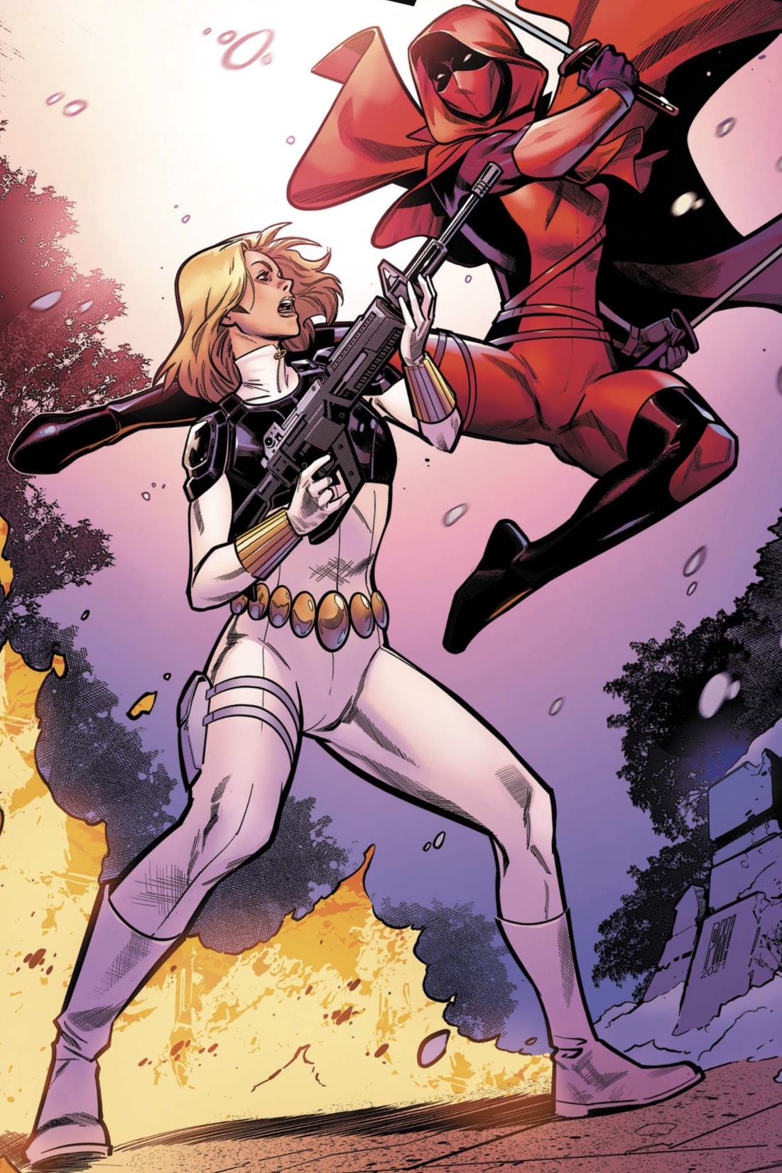 In Black Widow vol. 1 #1 -2 (June-July, 1999), Yelena was assigned to retrieve the "Deathless Frenzy", a bio-weapon which been sold to Colonel Khan of Rhapastan. Learning that the "Americans" had assigned Romanoff with the same mission, Yelena saw it as an opportunity to face her predecessor. She stalked Natasha all the way to Rhapastan but found herself ambushed by a number of soldiers. Yelena and Natasha briefly joined forces in incapacitating their attackers. But then Yelena declared her intentions to prove to be Natasha's superior and even threatened to kill her predecessor. Natasha however soon managed to escape with a stolen truck and several written documents on the bio-weapon. She left Yelena to fend for herself against reinforcements arriving on the scene. But Yelena actually managed to stow away on the truck.